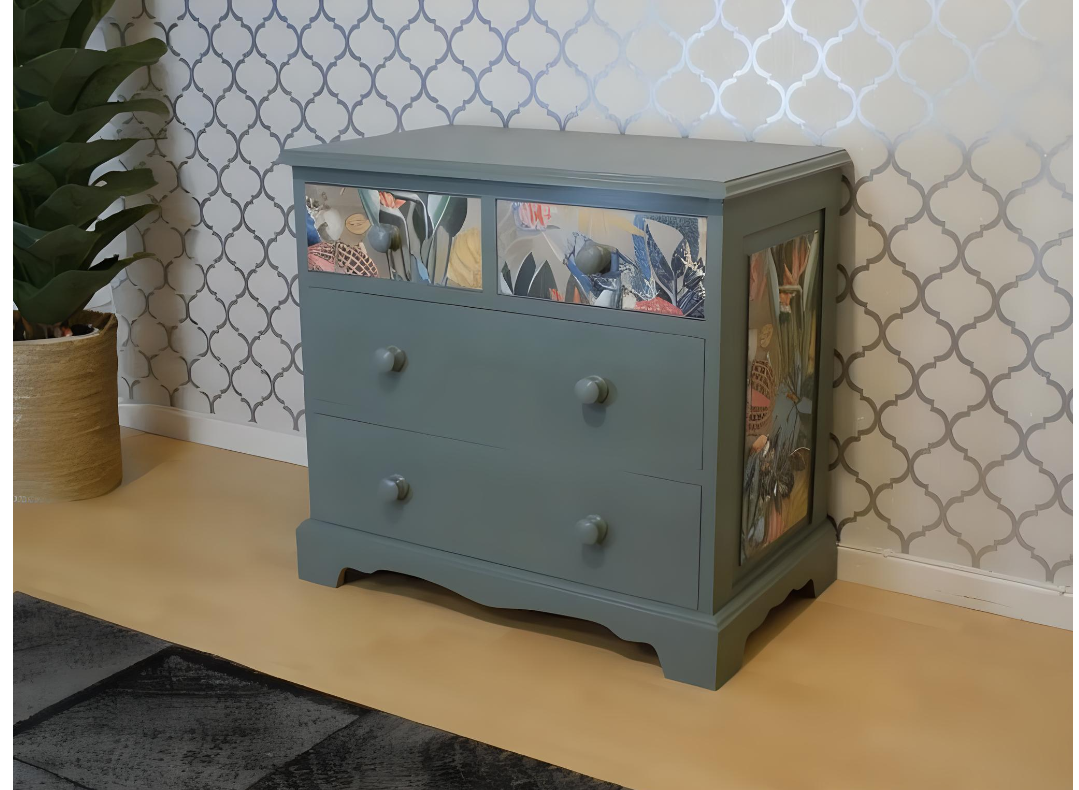 PineDresser in Serenity green with wonderland print in gold