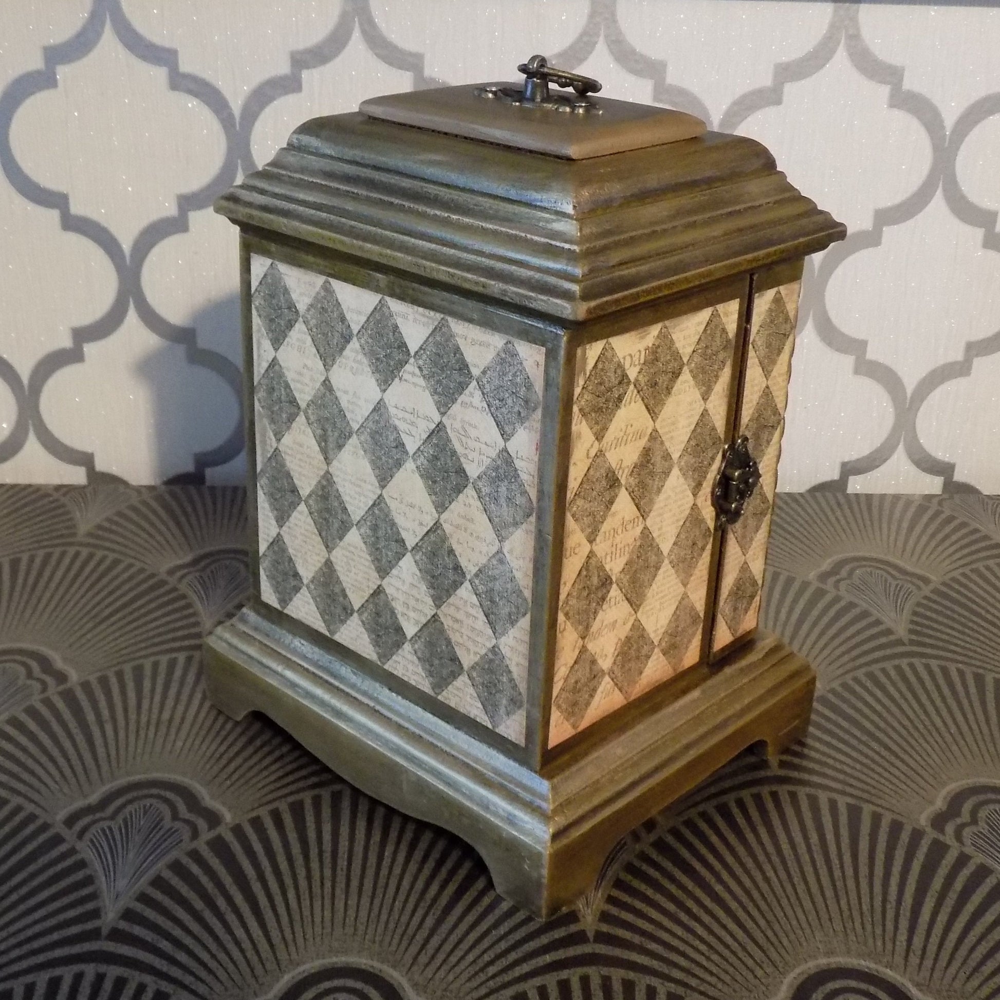A beautiful replica of an Antique Mantel Clock with Hidden Drawers used as a secret jewellery box but could be for hiding any number of small items. Styled with a harlequin design in yellow and Gold over the wood.