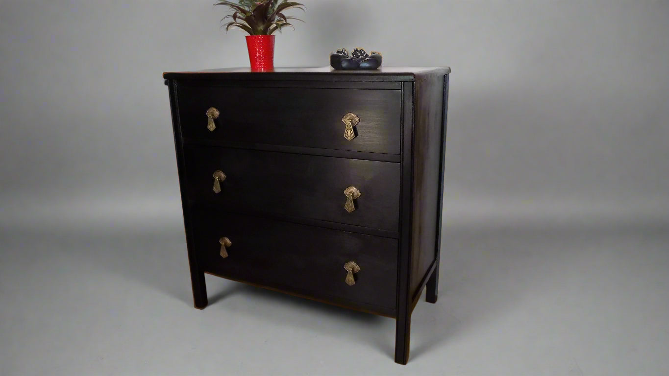 Small 3 drawer dresser with art deco style brass handles. From shabby to deco chic!